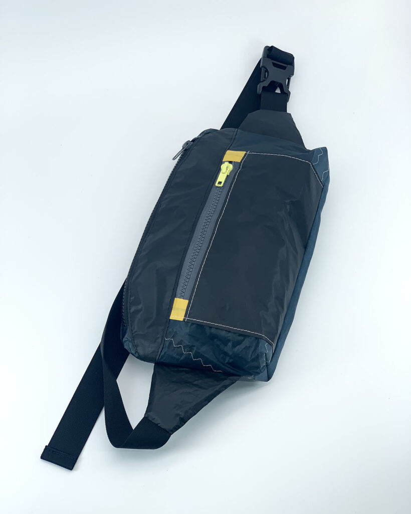 – Cousu à partir de matières issues de l’économie circulaire: voile de kitesurf, bateau
